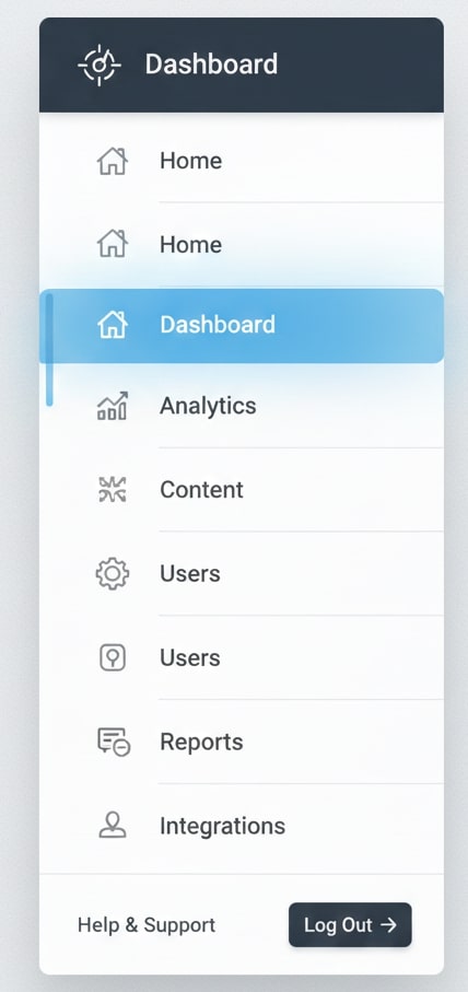Ideal for content-heavy or documentation sites. A left-hand sidebar supports deep hierarchies and persistent contextual links. Keep the active section highlighted and collapse subtrees to avoid overwhelming users.