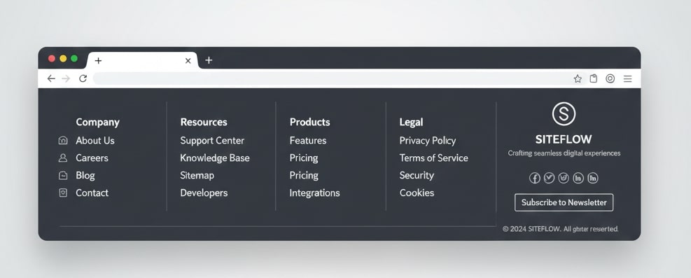 Footer navigation is a place for secondary links such as privacy policy, terms, careers, contact, and other less-used pages. Footers also help users who scroll to the bottom find additional info and can serve as a secondary navigation hub for SEO by linking to key resources, sitemap, and category pages.