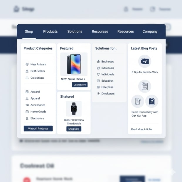 Useful for large e-commerce or news sites with many categories. Organize content into clearly labeled columns with section headers, featured links, and quick filters. Ensure mega menus are keyboard accessible and load quickly to avoid harming crawlability.